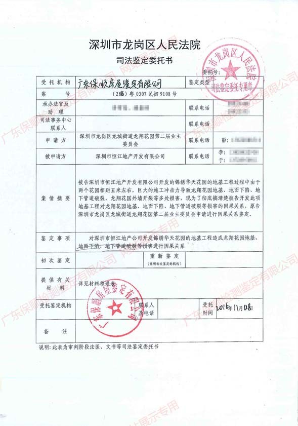 由深圳市龍崗區人民法院審理的深圳市龍崗區龍城街道龍翔花園第二屆業主委員會與深圳市恒江地產開發有限公司糾紛一案中,因案情需要,受深圳市龍崗區人民法院的委托,我司對深圳市恒江地產開發有限公司錦繡華天花園的地基工程與龍翔花園1棟5、6單元房屋上部結構開裂的因果關系進行房屋檢測鑒定。