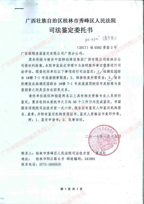 由廣西壯族自治區(qū)桂林市秀峰區(qū)人民法院審理的原告陳*訴被告中國移動通信集團廣西有限公司桂林分公司侵權糾紛一案,因案情需要,我司對原告桂湖花園綜合1#樓房屋(以下簡稱“該房屋”)的損壞程度和該房屋的損壞與被告在該房屋屋頂建設的信號發(fā)射塔之間是否存在因果關系進行相關房屋檢測鑒定。(該房屋位于該棟建筑7層7-1戶,受鑒定范圍所限,本次鑒定不包含地基基礎部分,僅對上部結構進行評定)