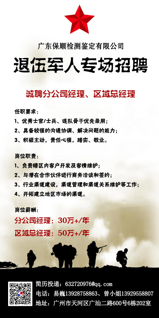 軍人把自己寶貴的青春歲月,獻給祖國的國防事業。當卸下了軍銜、脫下了綠色的軍裝退伍離開后,不應該只能從事保安、建筑等單一行業。廣東保順檢測鑒定有限公司熱忱歡迎各位退伍精英加入我們的團隊,繼續拼搏實現人生夢想!