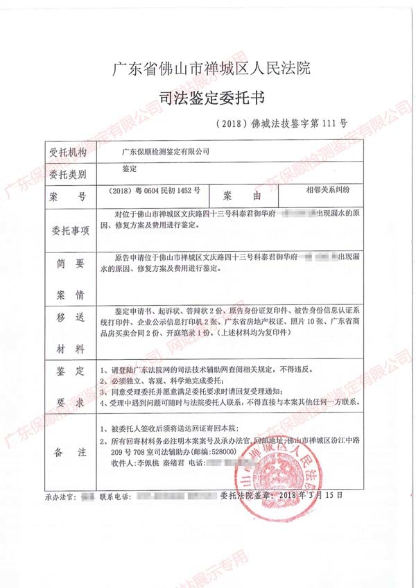 由廣東省佛山市禪城區人民法院受理的原告李**、趙**訴被告譚**、翟**相鄰關系糾紛一案,因案情需要,受廣東省佛山市禪城區人民法院的委托,廣東保順檢測鑒定有限公司對位于佛山市禪城區文慶路四十三號科泰君御華府**房出現漏水的原因進行鑒定。