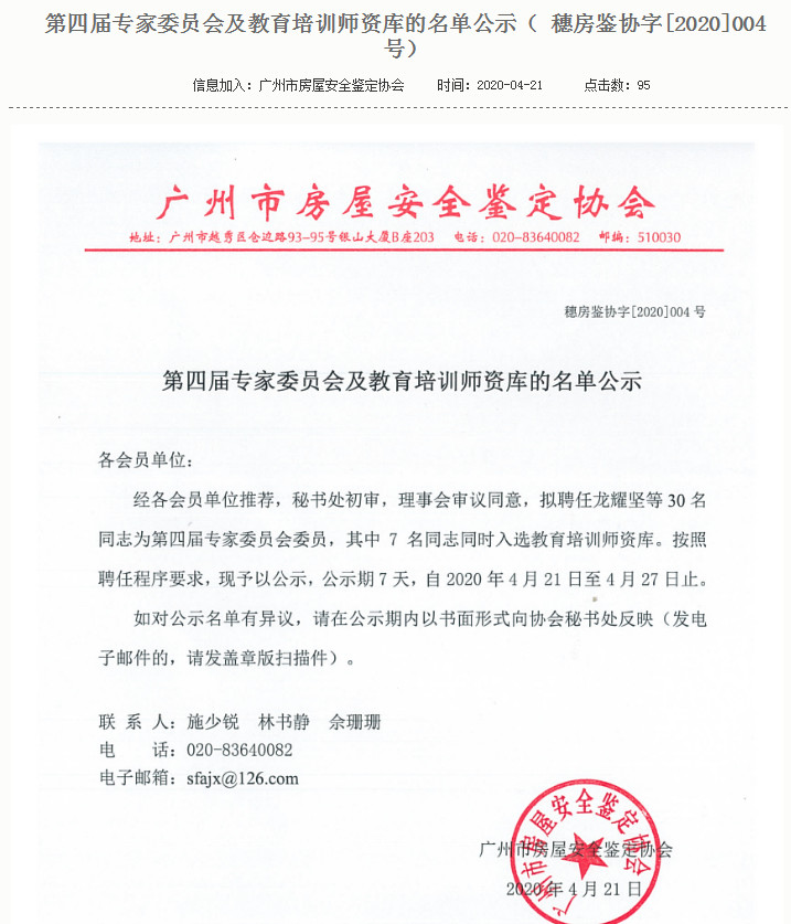 2020年4月21日,廣州市房屋安全鑒定協會發布第四屆專家委員會及教育培訓師資庫的名單,根據《第四屆專家委員會及教育培訓師資庫的名單公示》( 穗房鑒協字[2020]004號),我司(廣東保順檢測鑒定有限公司)技術總工江洪波被聘任為廣州市房屋安全鑒定協會第四屆專家委員會委員。