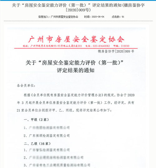 2020年6月4日,廣州市房屋安全鑒定協會在官方網站上發布了《關于“房屋安全鑒定能力評價(第一批)”評定結果的通知(穗房鑒協字[2020]009號)》,公布了本次分別獲評甲、乙、丙級的單位,共有21家獲評,其中獲評甲級的僅有兩家,保順為其中一家。