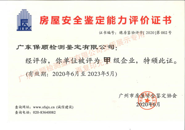 廣東保順檢測鑒定有限公司于2016年被廣東省建設工程質量安全檢測鑒定協會評為房屋安全鑒定能力甲級企業,本次評定為繼廣東省建設工程質量安全檢測鑒定協會后被廣州市房屋安全鑒定協會評為房屋安全鑒定能力甲級企業。