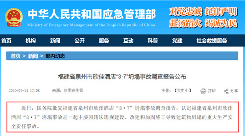 2020年3月7日19時14分,位于福建省泉州市鯉城區(qū)的欣佳酒店所在建筑物發(fā)生坍塌事故,造成29人死亡、42人受傷,直接經(jīng)濟損失5794萬元。事發(fā)時,該酒店為泉州市鯉城區(qū)新冠肺炎疫情防控外來人員集中隔離健康觀察點。