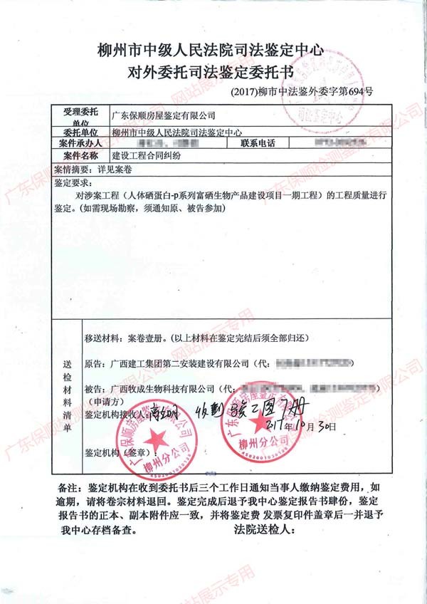 受柳州市中級人民法院司法鑒定中心的《司法鑒定委托書》,我公司對該委托事由進行檢查、鑒定。本次鑒定的主要工作內容如下: