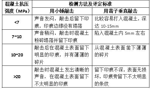敲擊法實際上是依靠構件聲音的頻譜分析方法,主要是根據小錘敲擊混凝土所發出的聲音和在混凝土表面留下的印痕以及邊緣塌落的程度及鑿子打入混凝土的深度等進行混凝土強度評定。